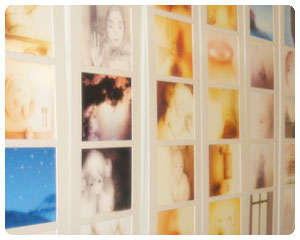 昼Spaceの壁面を利用して、「楽園の未」の原画を展示しました。55枚を5枚ずつ縦に並べた、絵コンテノートのような作品です。 近くのテーブルには下絵用のスケッチブックも配置しました。小さなスケッチブックを更に四等分した小さなサイズで、私は下絵を描きます。 小さな下絵を引き延ばし、A4の原画として色を付ける。そこからアニメーションをつけて、3分間のアニメーションが完成するのです。 |